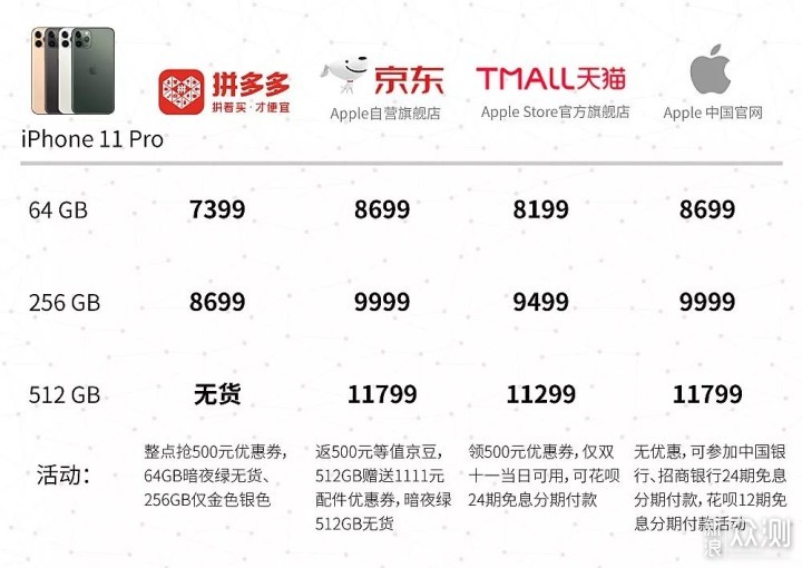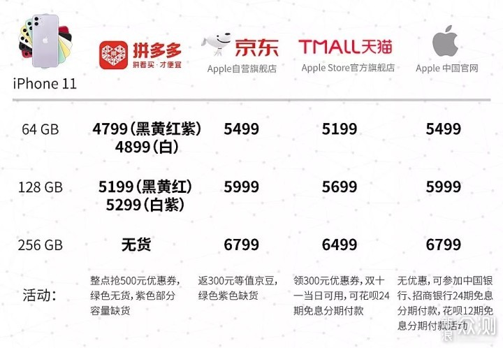 (虽然官方将活动时间限定在11月1日至3日,但当前京东仍然提供了优惠活动) 当然,相较于天猫平台,京东平台还是存在一些劣势,首先就是京东并没有提供多期的免息分期活动,它只提供了京东白条95折优惠券,这意味着你需要先一次性付清所有的货款而无法使用免息分期的优惠。 其次就是由于活动已经开始多天,因此京东平台出现了部分机型缺货的问题,比如暗夜绿的iPhone 11 Pro系列,或是绿色以及紫色的iPhone 11的热门容量,它们都会随机补货,这意味着想要买到心仪的款式,可能还需要手动时刻刷新一下。