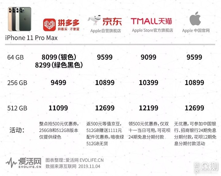 为了方便各位了解iPhone在双十一的价格,我们也准备一张图表,希望各位能一眼看清各个平台的价格情况,那么问题来了,你会选择在双11购买iPhone呢?还是继续多“等等党”,等待双12呢?