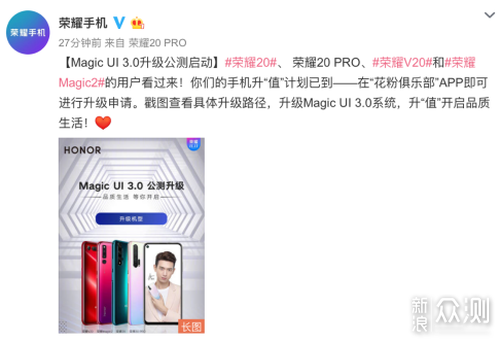 10月23日,荣耀手机官方宣布Magic UI 3.0的升级公测计划正式开启,今日,荣耀手机官微又公布了升级路径,四款荣耀机型——荣耀20、荣耀20 PRO、荣耀V20和荣耀Magic2的用户均可在“花粉俱乐部”APP进行升级申请,只需八个步骤即可开启全场景式智能生活体验