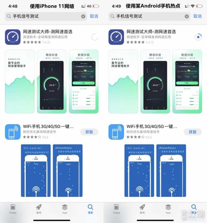 实际上,iPhone 11的信号,真的不咋地。上图,实我使用iPhone 下载App的时候的情形。我家这边,4G信号的确不强,但是日常使用,看个视频、下载个东西还是不成问题。但是今天,iPhone 11下载软件就一直缓冲。但是连上了某Android手机的热点,马上就可以开始下载了。 还是自己的测试靠谱,iPhone 11的信号强度,肯定是技不如人。 另外有一点感受:iPhone 11我是放置了一个电信卡和一个移动卡,对比以往使用的某款高通处理器的Android手机来说,比如地下车库、电梯等位置,同样都是没有信号。但是,从这些位置到室外或者室内之后,iPhone 11的4G信号搜寻,对比来说也要慢很多。这是我自己的亲身体验,iPhone 11信号差不是以讹传讹,是真的差。