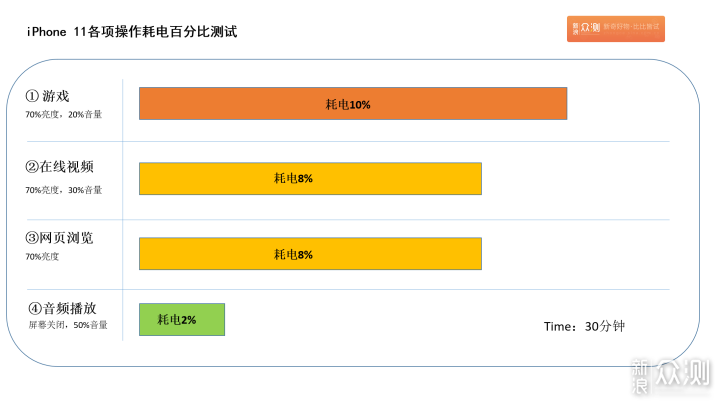 最后,说一下日常使用的情况。 使用iPhone 11,目前是一个周多一点的时间。平时由于在办公室办公,我一般是微信使用PC端,然后日常就是电话、微博、新浪众测这些App的使用(以前一直用Android,iPhone账号不通用,所以我除了测试,基本不用iPhone玩游戏)。工作日比较忙一些,每天早晨充满电拿到公司,一天的使用下来,下班的时候基本维持在30%-40%之间的电量。然后晚上回家之后,会进行一定的功能测试和使用,基本晚上10点我就充上电了,第二天早晨才拔下充电器。 这是我日常的使用习惯,我想说的是,日常上班使用,电量还是OK的。但是从我的实际测试结果来看,并不比Android省电,甚至游戏、在线视频,我认为iPhone 11的耗电量,对比来说更高一些。 答案:iPhone 11,待机情况的确很一般。