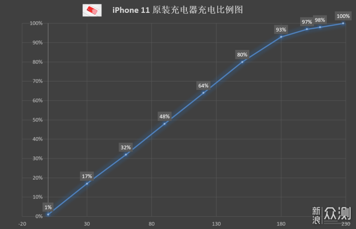 我也使用图表的形式,进行了确切的充电时间/比例的记录,结论如下: 30分钟,iPhone 11的充电速度,大概在16%左右; 80%的电量之后,iPhone 11进入到了慢充的状态,并且慢充的速度随着电池电量的增高而不断的变慢。 虽然,iPhone 11没有标配PD快充头(iPhone 11 Pro/Max都有标配),原装充电器充电慢是在预料之中的,但是没有想到的是,竟然这么慢!原则上说,iPhone 11也是绝对的旗舰手机,苹果非要用户在充电器上面再多花一份钱,还是不好理解。这一点,必须给差评。