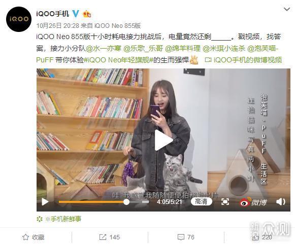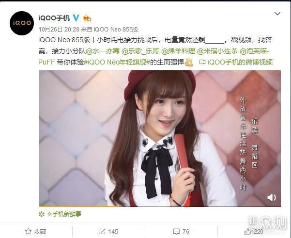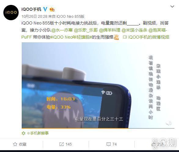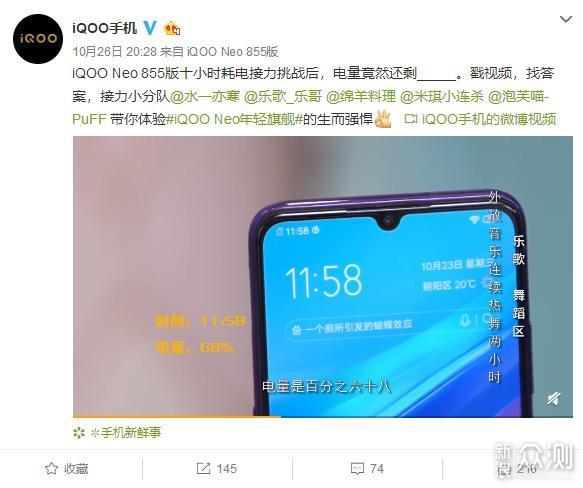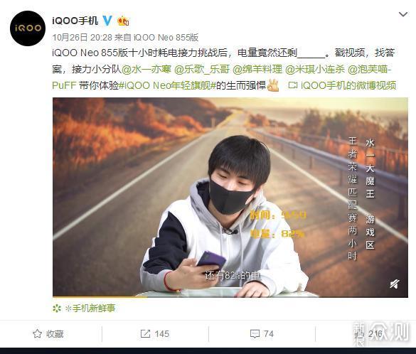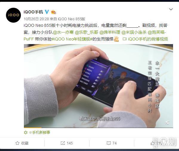 10月26日,iQOO手机官方微博放出了iQOO Neo 855版十小时耗电接力挑战视频,五位up主@水一亦寒 @乐歌_乐哥 @绵羊料理 @米琪小连杀 @泡芙喵-PuFF分别进行王者荣耀匹配赛、外放音乐、配音录播、美食直播、连拍猫咪写真,每人分别挑战2小时,一共10小时。测试结果是:iQOO Neo 855版在完成上述10小时测试后还剩电量23%,这样的表现是不是很厉害?是不是很心动?先别激动,下面我们先来看看这五位up主的挑战内容: