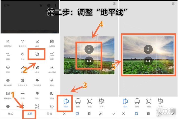 1-点击“工具” 2-选择“视角”(可看到4个调整工具) 3-如果倾斜角度很小,可选择第一个“倾斜”工具 4-手指“左右”滑动屏幕可调整平行线,“上下”滑动可调整垂直线。 5-对照白色参考线,可调整好地平线(注意,如倾斜角度过大,不建议用此款工具)