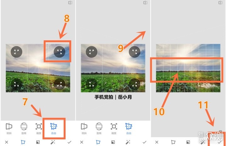 7-选择“自由”工具(画面出现4个方向箭头) 8、9-根据原图情况,只需向右上角拉动画面,即可调平“地平线” 10-同样根据白色参考线,最终确定“地平线”调平。 11-点击右下角“对号”进入下一步