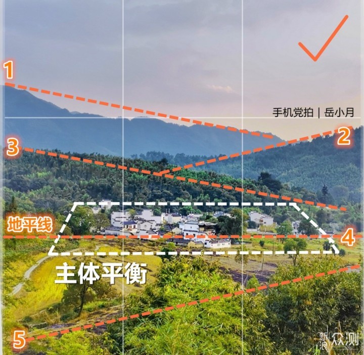 有了“网格线”帮助,我们能快速“找平”,但一共两条横线,我们该将画面中的“地平线”放在哪条线上呢?