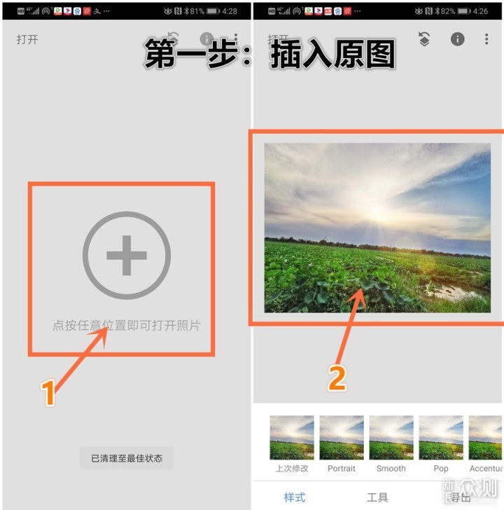 1-手机打开snpaseed,点击“+”开始 2-从手机相册中找到并打开“原图”