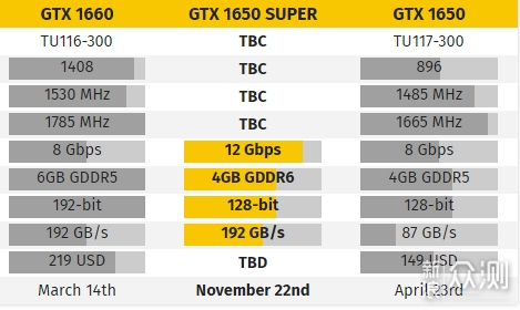 9、   GTX1650 Super显卡或11月22发布 GDDR6显存带宽大增   NVIDIA继续有条不紊的丰富着产品线。 消息称,10月29日,GTX 1660 Super将发布上市,相较于GTX 1660,最大的变化就是升级为速度更快的GDDR6显存,价格也仅仅贵了10美元。 不过,这还没完。VCZ爆料,GTX 1650 Super将于11月22日登陆。和“哥哥”1660S的变化类似,GTX 1650 Super同样换装了GDDR6显存,不过针脚带宽12Gbps,虽比1660S的14Gbps差点意思,但对比现在GDDR5显存的8Gbps可是提升了50%,总显存带宽一口气增加到了192GB/s。猜测GTX 1650 Super的频率、流处理器数量依然会和1650保持一致,价格也基本持平。 无疑,GTX 1650 Super上市后,AMD新出的RX 5500系列就要遭遇当头一棒了,NVIDIA依然不愿意给AMD任何机会。