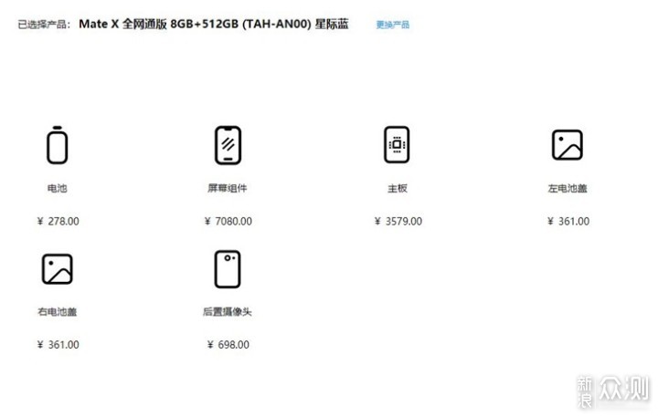 华为官方公布了华为Mate X的维修价格(保外或人为损坏),其中电池更换278元、更换/维修屏幕7080元、更换/维修主板3579元、更换/维修左右电池盖361元,更换/维修后置摄像头698元。
