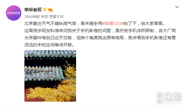7、 荣耀V30还没发布 荣耀老熊已经公布了新机拍照样张   荣耀业务部副总裁熊军民在微博曝光了荣耀V30的拍照样张,微博的发布来源正是荣耀即将发布的荣耀V30手机。荣耀业务部副总裁熊军民在这条微博中表示,该图片由荣耀V30拍摄,微博中还解答了一些网友提出的关于手机影像的问题。荣耀老熊还在这条微博中表示“虽然受手机体积限制,各大厂商光学器件堆叠已近天花板,但换个角度跳出原有格局,就会看到手机影像还有更深远的未知空间等待开辟”。从配图中可以看到,照片拍摄的是屋顶和银杏。照片的色彩表现出色,准确还原了金黄色的银杏叶子和红色的墙体。此外,照片中层次感也表现的很好,远近错落的砖瓦和银杏树都有体现出来。荣耀将于11月26日在北京举办荣耀V30系列及5G智慧全场景发布会,发布荣耀V30系列手机。荣耀V30的亮点颇多,采用挖孔屏设计,支持NSA/SA双模5G,还有令人期待的荣耀多维相机矩阵Matrix Camera摄影技术。