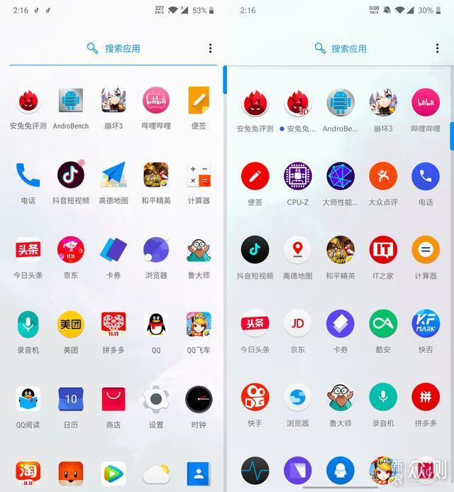 可以看出,同样90HZ的7 Pro在续航方面明显要比最新的7T Pro续航更长,大概因为长时间玩游戏时7T Pro功率更高,发热更严重,导致续航变短。我们大可以归咎为高通855Plus本身的功耗更高,但CPU只是原料,厂商的优化才是一道菜好吃与否的关键。更旗舰的CPU没有带来更好的味道,不免让人产生产品倒退的嫌疑。 充电情况,两台手机同时充电1小时,一加7 Pro充电75%,7T Pro则是89%,要知道后者的电池容量比前者还高了85mAh,可见"Warp闪充30T"的确有着明显的优势。 7T Pro比起7Pro更差的续航和更快的充电,客观的造成了靠充电速度弥补续航短板的错觉,不免有些顾此失彼。还需完善的氢OS 系统UI方面,两代手机的系统都为扁平化风格,7T Pro的图标统一后更圆润,观感上的一致性更为和谐。