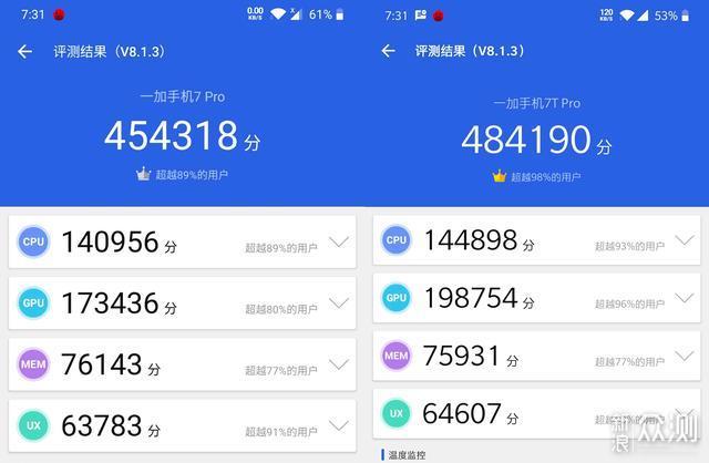 吃鸡一小时和王者荣耀一小时后,两台手机发热均在可接受范围内属于温热态。但长时间玩也能明显感受到7T Pro温度稍高,大概是因为高通855Plus单核频率较高的副作用。至于游戏具体功耗,后面我会详细说明。 同样都是UFS3.0闪存的两款一加在读取测试中出现了更加意外的结果。
