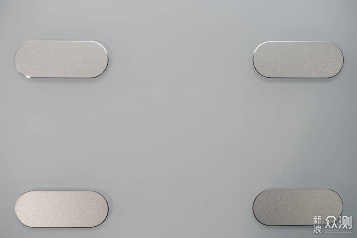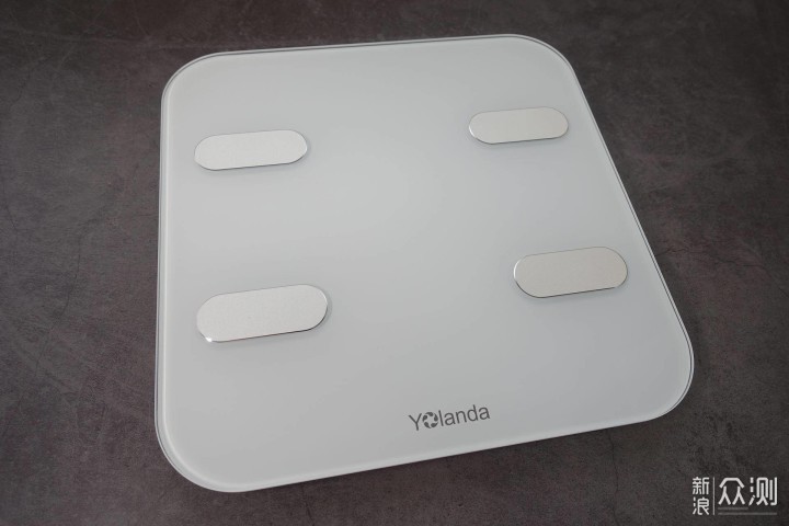 正面上方的显示区域是隐藏式的,需要通电使用时才能看得到。然后体脂秤正面就还有正下边缘上的云康宝LOGO标志,整体看起来比较简洁和清爽。