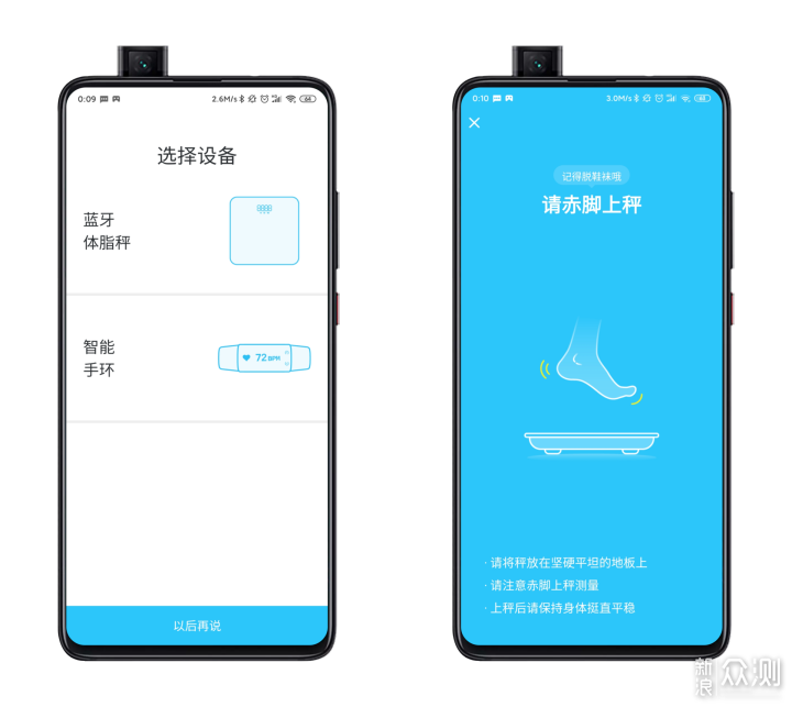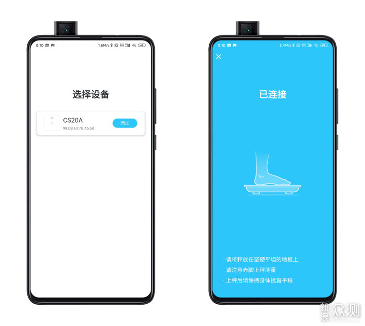 好了开箱部分到此结束。 体验作为一款智能体脂秤,使用的第一步自然是下载相应的App并连接了。这款云康宝CS20A一共支持轻牛健康、华为智慧生活、薄荷、Keep四种App的连接。这就给具有不同手机和App使用习惯的用户带来了更大的选择自由。比如华为手机用户自然倾向于选择华为智慧生活进行连接,而那些习惯了用Keep健身的用户肯定会首选Keep了。我并没有特别的需求,因此选择了云康宝自家的轻牛健康App。