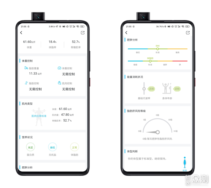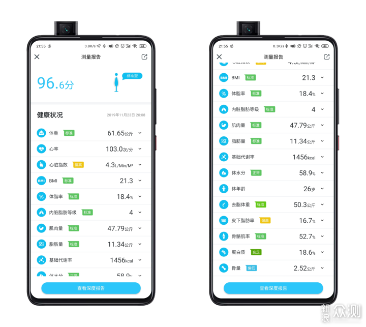 此外,我们还可以点击深度报告,在这里会根据测量数值做出进一步的分析。我173cm的身高,61.65kg的体重,得分96.6分,分数挺高的,要是我能再胖一点点就好了。