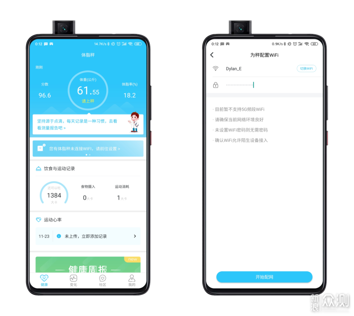不过,我们的绑定其实还没有结束,因为云康宝CS20A支持蓝牙和WiFi双模连接。那么蓝牙加WiFi双模的配置有什么优势呢。其实通过我们日常使用手机的经验就可以发现,蓝牙连接有时候并不是那么的稳定。手机和体脂秤通过蓝牙连接时,一般只有在使用时才会连接。如果不去拿手机打开App进行确认,一般是不能保证测量数据能够及时通过蓝牙上传到手机上的。而WiFi连接相对就可靠很多,使用的时候,体脂秤通过WiFi连接到互联网,并将测量数据上传到云端服务器。我们则随时都可以用手机查看,也不用担心测量结果丢失。而蓝牙也并非全无用处,有时候急于想看到测量数据,边看手机边测量时,蓝牙就可以将结果实时地传输到手机上显示了。不过我个人认为,如果网络状况比较好的话,WiFi单模其实就足够了,数据上传到云端再回传到手机上也不会有太大延时。 云康宝CS20A连接WiFi的步骤也不复杂。轻牛健康App首页会提醒你将设备连接到WiFi。选择2.4G频段的SSID,并输入密码。