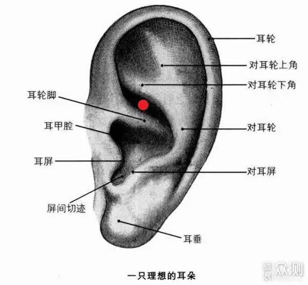 (图源网络:侵删) 这是一个正常人的耳朵,正常佩戴耳机只需放上即可,但JEET Mars不同,耳机佩戴后还需要耳机上半部分轻轻按压一下,让耳道和对耳屏以及耳轮脚上部分的耳沟形成一个三角形,简单点说就是戴上之后要将耳机上半部分按压到耳沟部分,就是上图红点标识的地方。当然以上原因也有可能是我个人耳道偏扁平的原因,如果是那种招风耳应该不用像我这样。