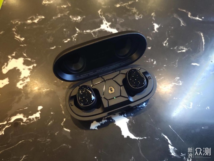 耳机盒同样采用多面体切割设计,外层包裹着皮质外衣,整体没有任何不平整或者是毛边,握持在手中的柔韧手感,让我不得不为其再次称赞,耳机盒内的手感则是磨砂质感,内有不规则多边形,配合蓝色的指示灯点缀,科技感十足,虽然很好看,但不得不说JEET真的有点逼死强迫症的感觉。