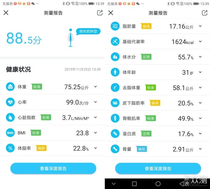 测一下我自己的数据。脂肪量和脂肪率有点偏高,骨量有点低……其他的都正常。 可以看到,这里的数据非常详细,只要人站上去,等一会儿就行。使用非常简单,结论却又非常专业。如果想了解更多,还可以点进深度报告里。 连WiFi的时候验证了我的猜想:连接WiFi时人也需要站上去,确实一定的重量就是云康宝这个体脂秤的开关。