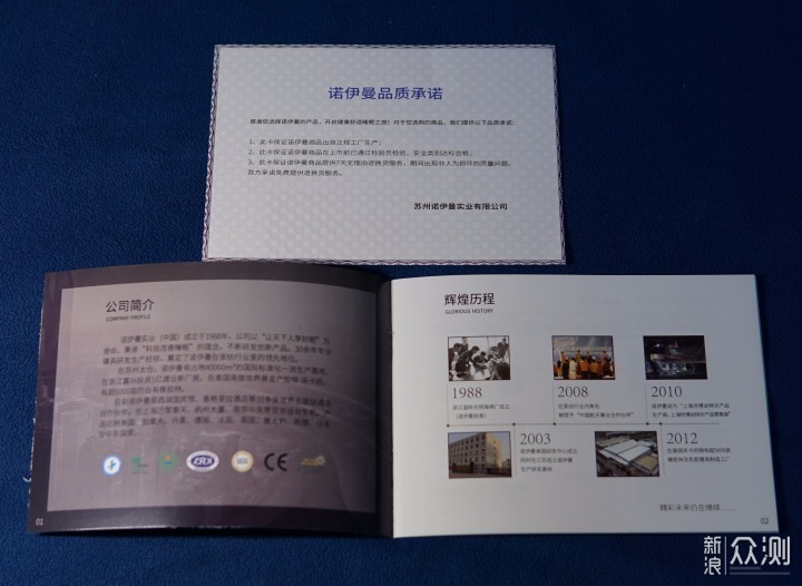 包装袋里除了枕头,还有这张品质承诺书(背面是退换货登记卡)及产品手册。产品手册前两页是公司简介和发展历程等,简单看了下,这家目前发展势头还是比较好的,和十余家五星级酒店有合作,产品也远销至海外多国。