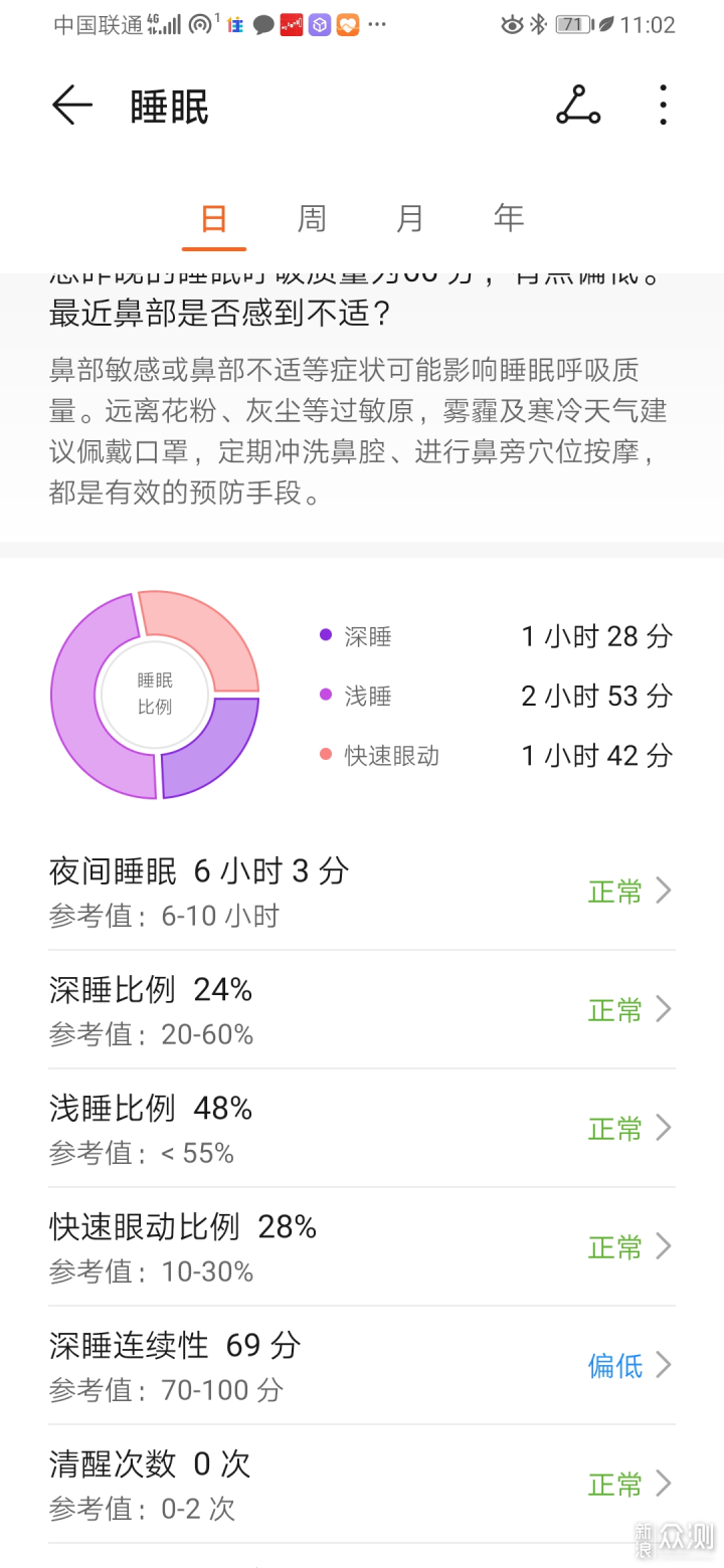 这是使用这款枕头第一觉的数据,深睡比例似乎并没有明显提升的样子?可能是刚换枕头还没适应?过一段时间再看吧。 总结:总的来说,这款枕头暂时还是满意的,毕竟5折白菜价入的,睡眠体验也确实改善了一些,至于优缺点呢,目前的体验还不太够,过段时间再说吧。