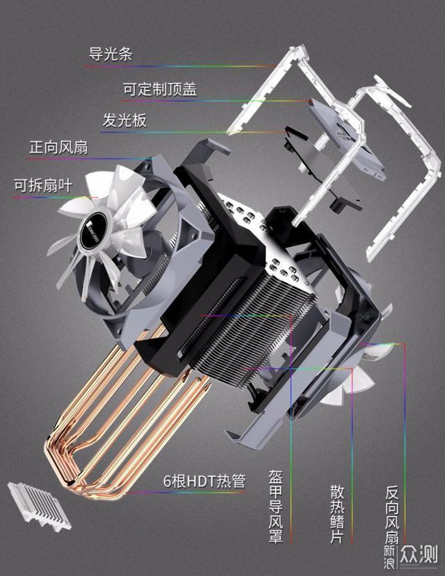 ▲我就不做拆解了,我这动手能力估计拆了就装不上了,从官方图片可以看到,风扇可拆卸清洗,替换,顶盖可以定制,同向2个风扇将散热鳍片的热量带离。6跟HDT热管复制热交换。