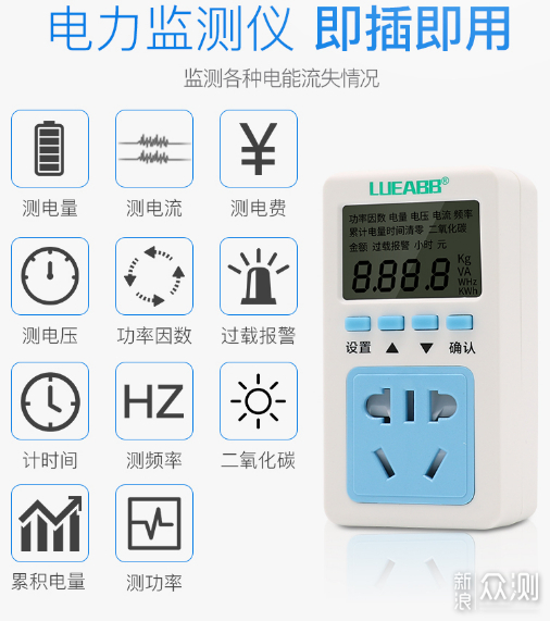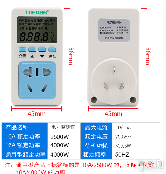 对于抓电耗子,我们需要一款操作简单,功能强大的产品,而这款产品基本上满足了我们的需求,先看产品功能,这款产品共有两种型号,10A/2500W和16A/4000W。10A/2500W为一般家用电器,如电脑、电视、电冰箱、电饭锅等功率不超2500W,16A/4000W的更适合电磁炉、电热水器、空调的监测。两种型号三脚插头间距不一样,也可以搭配转接头使用,需要注意转接头的额定功率及电流。(根据个人需求选择)