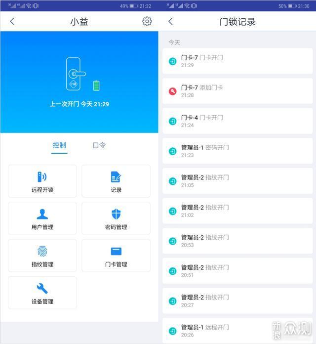 小益E206T还支持通过天猫精灵的App设置临时密码,并限定其有效次数及时间。以前出差或者旅游时,小JU老是得把钥匙送到朋友的家里去,让他们在这期间帮忙给我家中的汪星人喂食。有了这个功能后,一切都变得简单了起来。我只需要设置限时的临时密码,并将密码告知朋友即可。 8.组合解锁 通过天猫精灵的App,用户还可以设置组合解锁,进一步保障安全。此外,如果换用小益的智能芯片,用户还可以通过支持NFC的手机、手表或者手环来进行解锁,但是天猫精灵的芯片不支持此项功能,不得不说有些遗憾。希望后续的芯片在功能上可以有所统一。 此外,用户可以通过天猫精灵App查看E206T的电量状态,以及开锁记录,方便你对家庭的门锁安全进行时时监控。 总结小益E206T目前在某电商旗舰店的售价仅799元(指导安装)/999元(包安装),可以说是一款性价比极高的智能指纹锁。其锁体、锁芯的用料都非常扎实,素雅的配色和简约的设计也非常百搭,可以适配不同颜色和造型的门体。不过这款产品主打实惠,材质以及造型相比高端产品仍旧有明显差距。产品本身在保障安全性的同时,为用户提供了多种开锁方式,可以满足较多的使用场景,但是遗憾的是,天猫精灵和小益芯片的功能并未统一,用户必须做出一些取舍,希望后续的产品能进一步改善。 如果你的动手能力不像小JU这样菜鸡,建议选择购买不包安装的套餐,自己花几十分钟就能安装完毕,从此即可以体验智能锁带来的便利。就算像小JU这样,实在安不上了再求助专业人士也不难。