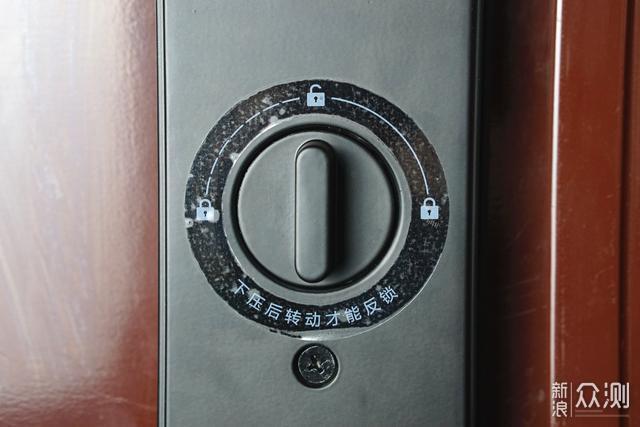 这款智能锁的内面板从上到下分别是电池仓、防猫眼开锁把手、扬声器孔和机械反锁旋钮。
