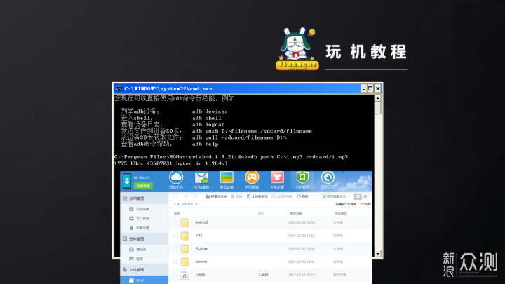 最后呢,Flashcer再给一点小建议吧: Q: 如何通过电脑上的ADB调试命令,复制视频或者图片,音乐等文件到小米手表? A: 当然,你可以使用电脑上操作指令,下载视频或者音乐等文件到其内置存储卡。Flashcer测试过,通过电脑上的命令下载一首mp3文件到小米手表的根目录下是很快的,如下图所示:
