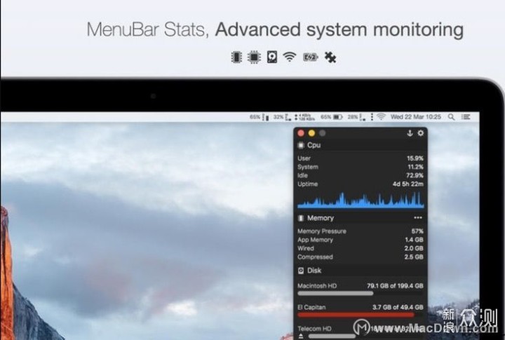 MenuBar Stats 这是一款menubar的小工具,稳定且占用资源少,它也是一款非常不错的系统检测工具。 MenuBar Stats具备5个高级的模块(CPU,内存,网络,硬盘,电池),每个模块可以是在结合窗口,或在自己的分开的窗口,对于更详细的信息,只需使用拖放和拖放重新排列你的模块直接从菜单栏或窗口,高度可定制的,通知大多数模块,显示或隐藏菜单栏的模块,密切控制你的电池健康。