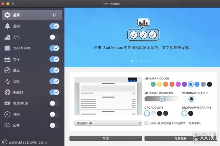 那么Mac系统监控软件哪个好?哪个最能有效的监测我们的Mac电脑呢?今天macdown小编搜集了一些Mac上优秀的系统监测软件,看看有没有大家中意的! iStat Menus iStat Menus可实时监控Mac电脑的CPU、内存占用情况;网络下载上传速度、流量;CPU、硬盘、显卡的温度;控制风扇转速;Macbook系列电脑的电池使用情况等,并且可以在顶部状态栏实时显示出来,是一款非常不错的macOS系统监控软件。 iStat Menus for Mac可能这些对于普通用户来说意义不大,但是对于开发者或者中高级用户来说还是挺有用的。