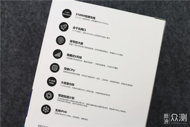 包装为白色风格,正面有产品图样,右上方“京东云”字样,下方标识:京东云无线宝。 产品有几大核心功能特色: (1)内置6根隐藏式双排天线和信号放大器,最高传输速率可以达到2100M,可以做到120~200平米房屋360°全覆盖,穿墙能力出色,告别家庭环境的死角问题,对于平时有网游,看高清视频等无断线烦恼。 (2)全千兆网口,一个千兆LWN口,两个千兆LAN口,满足家用100M以及以上光纤宽带需求。 (3)MTK2100双核四线程处理器,512M DDR3大内存,保证路由器长时间稳定运行状态,最多可以连接百台设备痛死上网。 (4)支持oOenwit和IPv6。 (5)支持Samba服务,通过USB接口对外接移动存储设备的访问管理功能。 (6)智能加速计划,这是这款路由器的最大亮点,基于京东云提供的技术支持,结合边缘计算技术,可以进行提前预下载视频等大数据,从而保证流畅的观影效果。 (6)闲置宽带积分计划,目前还在不断完善优化中。