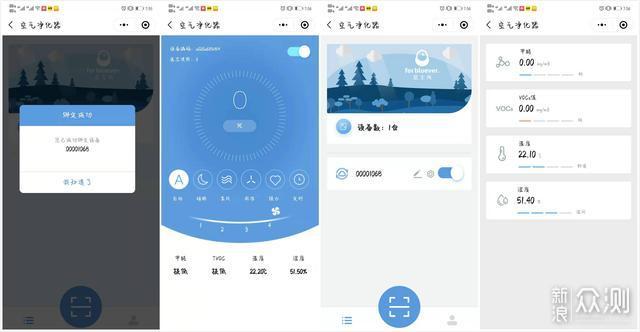 作为一款智能空气净化器,蓝主角支持手机绑定后通过微信小程序进行智能控制,同时显示具体的环境参数信息。