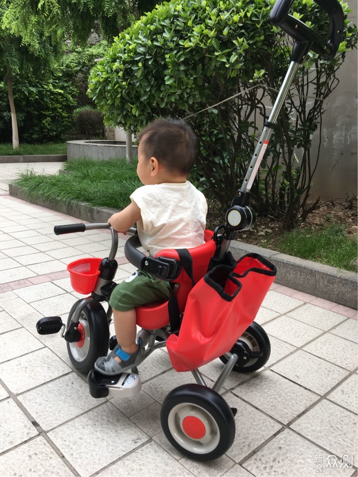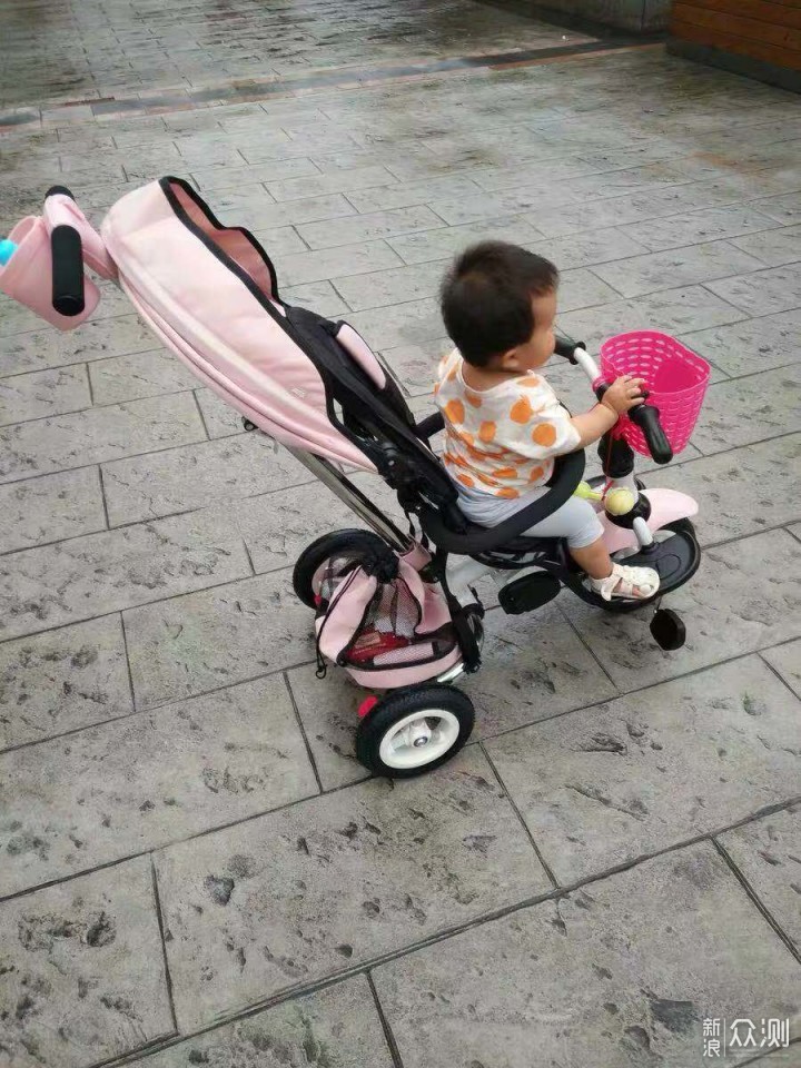 ⑦、储物功能: 带娃久了会发现,孩子出去一趟要带的东西还真不少,奶瓶、毛巾、湿纸巾等乱七八糟的一大推,有个储物篮总是好的,实在不喜欢还可以拆嘛,这一点上咱们国产品牌做的就是贴心,我很好奇,外国妈妈们带娃出门都空手的么,储物篮放在三轮车前面更方便儿童自取: