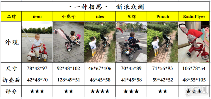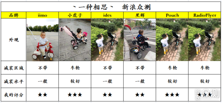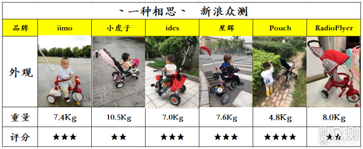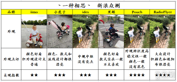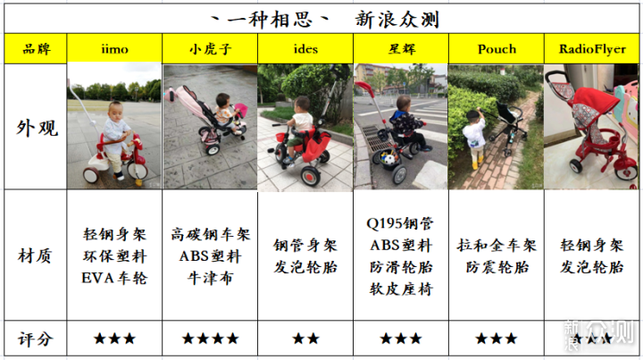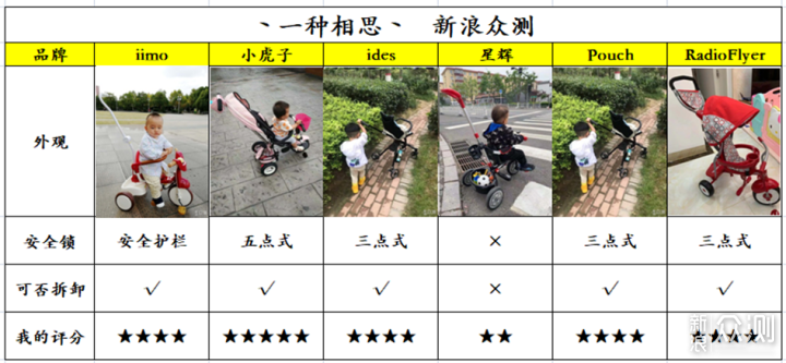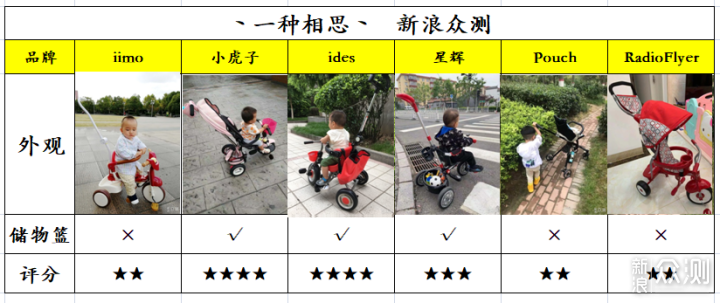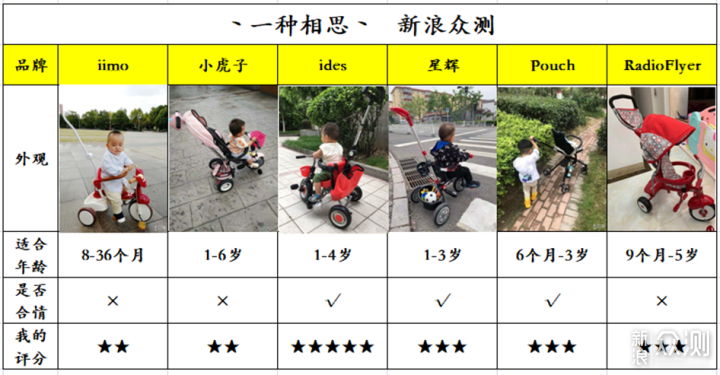 经过10个不同角度的横向对比,最后来做个评分汇总吧,一起来看看谁的得分最高(满分50分): 1、iimo:2+4+2+2+3+2+2+3+3+1=24 ★ 2、小虎子:2+5+3+3+2+4+4+2+4+3=32 ★ 3、ides:5+4+2+3+4+2+4+3+2+2=31 ★ 4、星辉:3+2+2+3+3+2+3+3+3+3=27 ★ 5、Pouch:3+4+3+4+2+4+2+4+3+3=32 ★ 6、R F:3+4+3+4+3+4+2+26+3+1=29 ★ 经过汇总,得分结果一目了然,小虎子和Pouch并列第一,但本人更倾向于小虎子,因为价格更低,质量更好。当然,这个评分只是我个人的想法,比如外观设计得分就见仁见智,不同的人喜欢不同的风格,很难做到让所有人满意。只是给大家一个参考,仅代表个人观点。最后一图是针对不同年龄段宝宝,更适合的车型,大家有针对性购买: