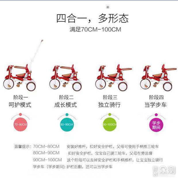 说明:宝妈们一定要注意,iimo这个品牌的三轮车,身高超过110cm的宝宝就不能用了。小虎子品牌在介绍时说适合1-6岁儿童,不符合实际情况,孩子超过4岁基本不会喜欢这种车子的,而且也伸不开腿。ides适合1-4岁没什么问题,星辉在介绍时说适合1-3岁儿童也符合实际情况,可是它不带遮阳伞,那么小的孩子风吹日晒的多不舒服。RadioFlyer适应年龄说到5岁那是不可能的,5岁的孩子多高了,根本用不了那种车型,有夸大之嫌。 ②、安全性: 选购儿童三轮车,要注意在把手及座位之间的区域不得有任何可能造成伤害的凸起,车体上不得有任何可能造成伤害的挤夹点,任何可能触及的活动部位上或活动部位之间的孔隙均应小于5mm或大于12mm,以防小孩夹伤手指,三轮车的脚蹬最低处离地不应小于40mm,避免儿童在骑行中脚部容易碰地导致受伤。 我列举的这几个品牌都是消费者协会检查合格产品,所以我从安全护栏多点式角度分析: