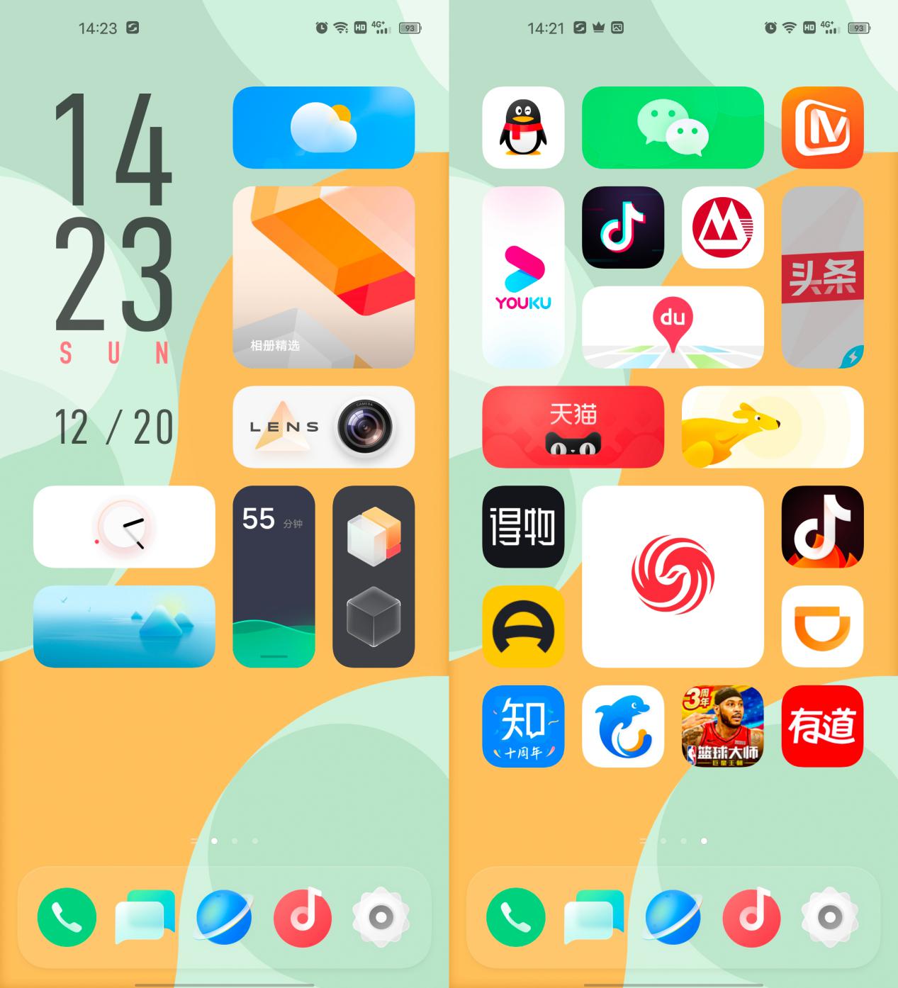 这就是OriginOS独树一帜的桌面架构所带来的改变:大量使用卡片式设计,带来了更多 “灵动变化”的美感,而且卡片的大小能够进行自定义调整,OriginOS桌面图标大小有 1 × 1 、 1 × 2 、 2 × 1 、2 × 2 四种不同的尺寸选择,用户可像俄罗斯方块那样在主屏幕上按照自己的喜好排列布局,能够找回一点当年玩Windows Phone磁贴的乐趣,也将屏幕展示风格的主动权掌握在自己的手中。